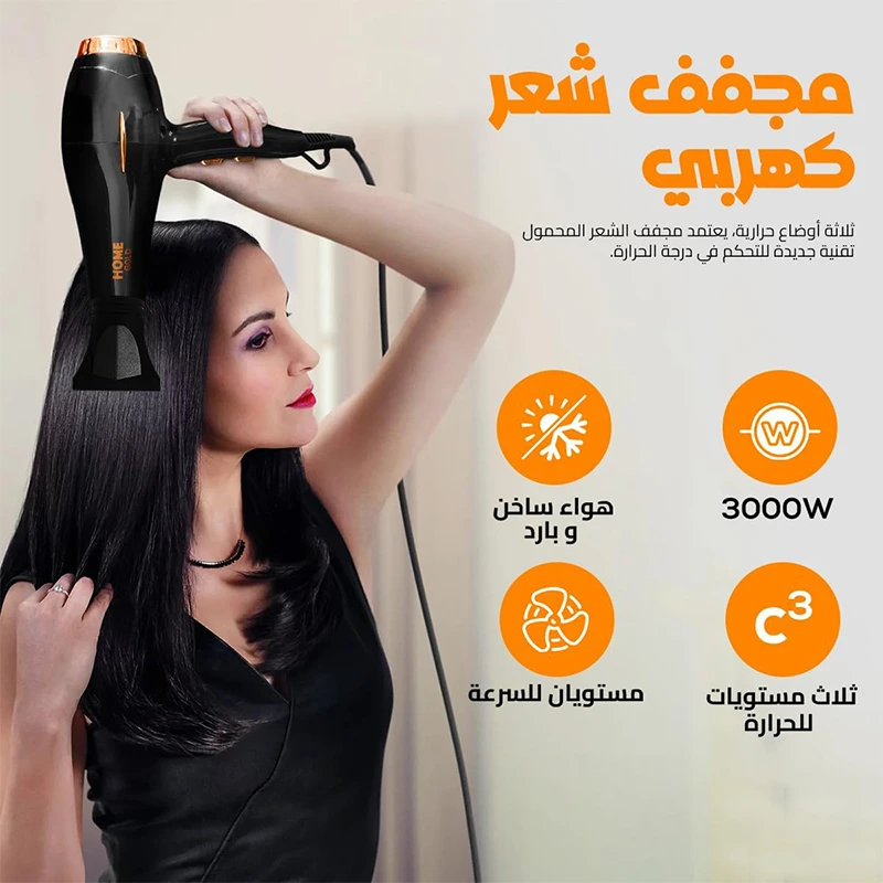 اكتشف المصفف بداخلك مع مجفف الشعر الاحترافي HOME GOLD! بقوة 3000 واط، يوفر المجفف أداءً استثنائياً حتى مع الشعر الكثيف، ليترك شعرك أملساً وخالياً من التجعد.