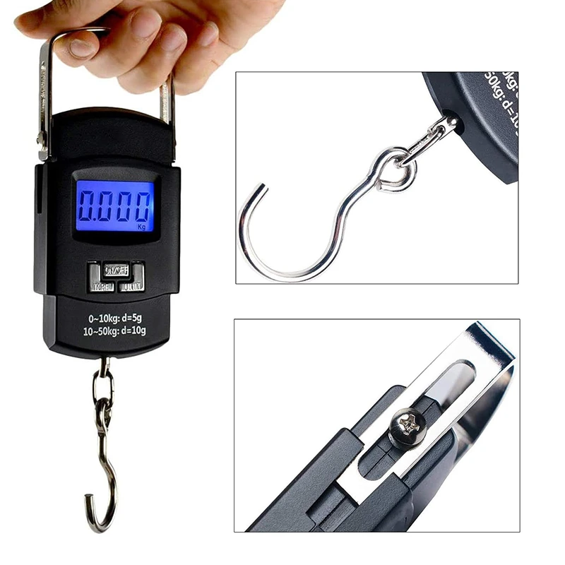 The hook scale is equipped with a blue LED display, powered by two AAA batteries (included)