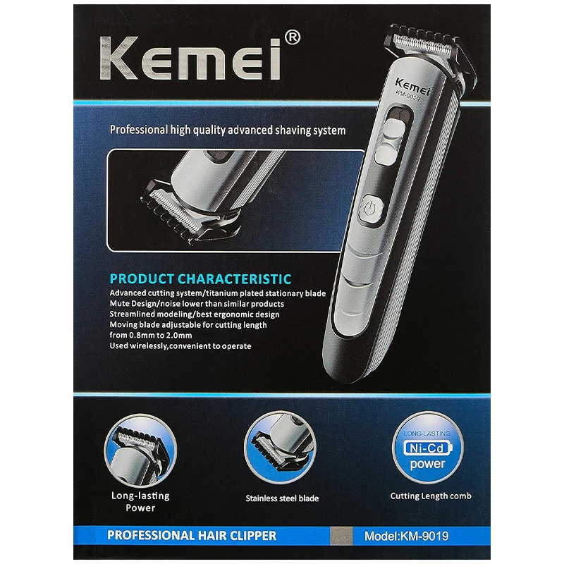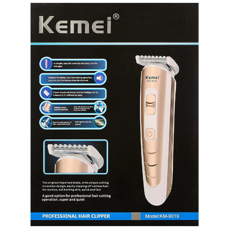The Kemei KM-9019 Professional Hair Trimmer is a high-performance grooming tool designed for precise hair trimming. It features sharp stainless steel blades for efficient and smooth cutting, suitable for both professional and personal use. The trimmer is equipped with an ergonomic design, ensuring comfortable handling during extended use. It also offers adjustable cutting lengths, making it versatile for different styling needs. The KM-9019 is rechargeable, providing cordless convenience and consistent power for grooming sessions.