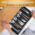 Maximize your space, time, and effort: This bamboo silverware organizer is great not only for a cutlery organizer in a drawer but also as a kitchen drawer organizer for large utensils such as spatulas, tongs, ladles, and more. The wood drawer organizer can tame your out-of-control kitchen drawers, to do kitchen drawer organization according to your rules.