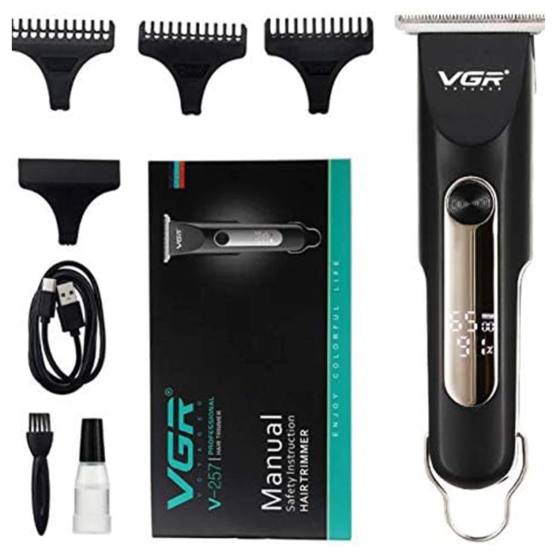 Say goodbye to cumbersome razors and expensive salons. The new trimmer from VGR, offers a salon-style trim, always. It comes with stainless-steel, skin-friendly blades, and comb tips, for the best shaving experience Professional Hair Clipper Digital Display Cord/ Cordless 3 Pcs Guide Comb Cleaning Brush Charging Adapter 100 minutes of operating time 1.5 Hours Charging Time Skin-Friendly Blades 5000mAh Lithium Battery Adjustable Cutting Length Lubricating oil