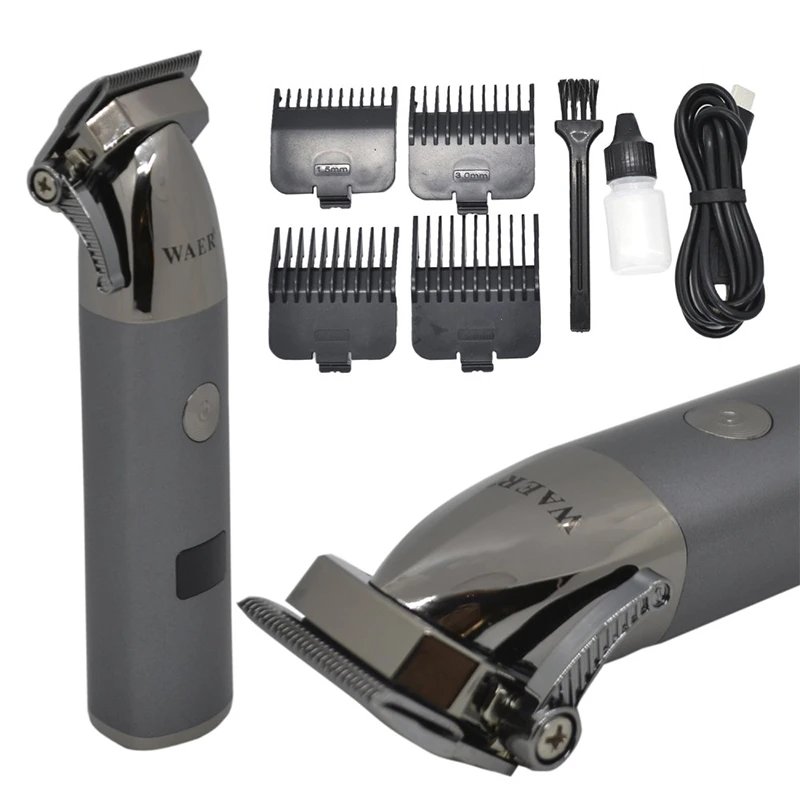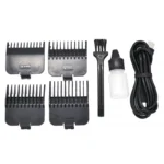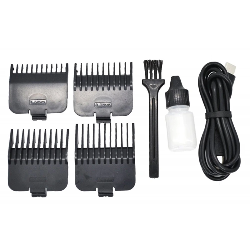 The kit includes a cleaning brush, blade oil, 4 attachments (1.5 mm, 3 mm, 4.5 mm, 6 mm), charging from a USB port.